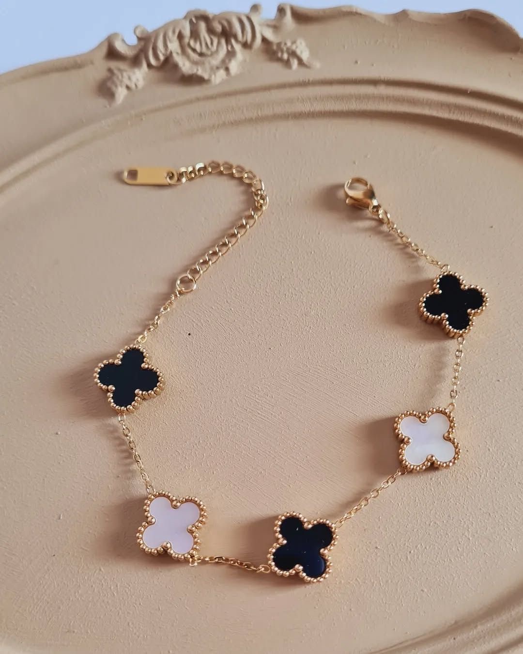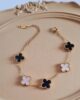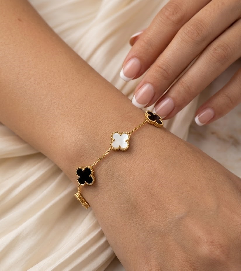 Elevate your everyday elegance with this 18K gold-plated bracelet featuring iconic four-leaf clover motifs. Crafted with alternating black onyx and mother-of-pearl inlays, each charm is framed by delicate beaded edges. The adjustable chain with lobster clasp ensures a perfect fit. Timeless, versatile, and effortlessly chic for day to night wear.