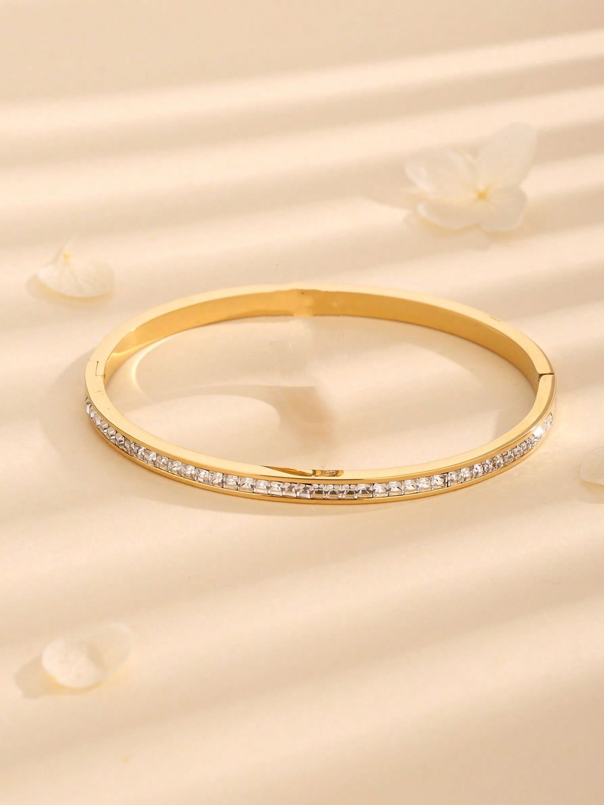 Embrace understated luxury with this sleek channel-set crystal bangle. Crafted in premium gold-plated stainless steel, it features a continuous row of brilliant square-cut crystals for a refined, modern sparkle. The slim silhouette makes it perfect for everyday elegance or sophisticated layering.