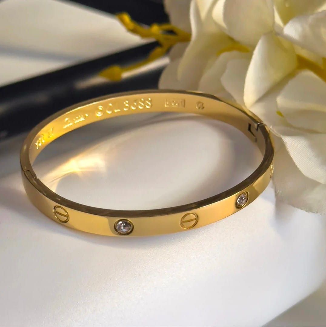 Discover timeless elegance with this iconic screw-motif bangle. Featuring a high-polish finish and sparkling crystal accents set in durable gold-plated stainless steel, this piece blends classic luxury with modern sophistication. An essential addition to any jewelry collection.